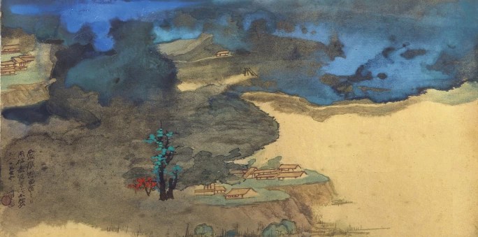轉化期(1941—1960年)以遠赴敦煌臨摹為轉捩點,他吸收了唐宋壁畫雄渾瑰麗的色彩與線條,畫風由明清的文人雅逸轉向隋唐的宏偉壯闊,為其藝術注入了高古氣息。此時期他致力於融合宋元山水的繁複結構與青綠色彩,並將五代董源、巨然等水墨傳統「青綠化」,建立其獨特的復古模式。